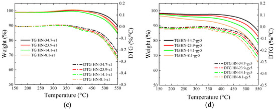 TG-DTG curves of HN raw and chemically modified samples. (a) HN raw samples. (b) HN−s5. (c) HN−s1. (d) HN−gy5.