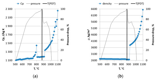 Discontinuities in specific heat cp and density are observed in the same temperature range as the drop in pressure in the drop test or the increase in fracture stress in the mechanical test. It should be noted that discontinuities in specific heat cp are mainly associated with phase transformations, while an increase in fracture stress is rather associated with a change in the microstructure of the materials of ash sample.