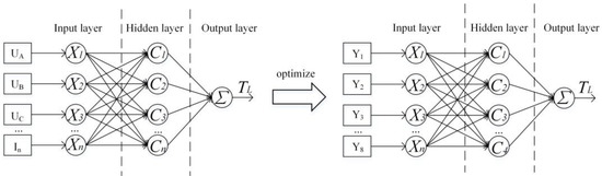 The total loss of the transformer can be calculated by using the zero-sequence impedance of the transformer, and then the transformer loss prediction model is trained by using the data detected by the distribution network and the total loss of the transformer. Although BP neural network can be optimized by using Sparrow Search Algorithm to seek the global optimal solution if SSA-BP neural network model is used for prediction directly, there is a strong correlation among the parameters, and it will lead to low accuracy of the model. The correlation among variables can be solved effectively by using Principal Component Analysis. By using Principal Component Analysis, the data collected from the distribution network z = {UA, UB, UC, IA, IB, IC, θA, θB, θC, In} are decreased to only eight principal components y = {Y1, Y2, Y3, Y4, Y5, Y6, Y7, Y8}. In the 2016 groups of data, the 1616 groups of data are used as the training samples, the 400 groups of data are used as test data and the accuracy is evaluated with average error. The input of network optimization is shown in Figure 1.