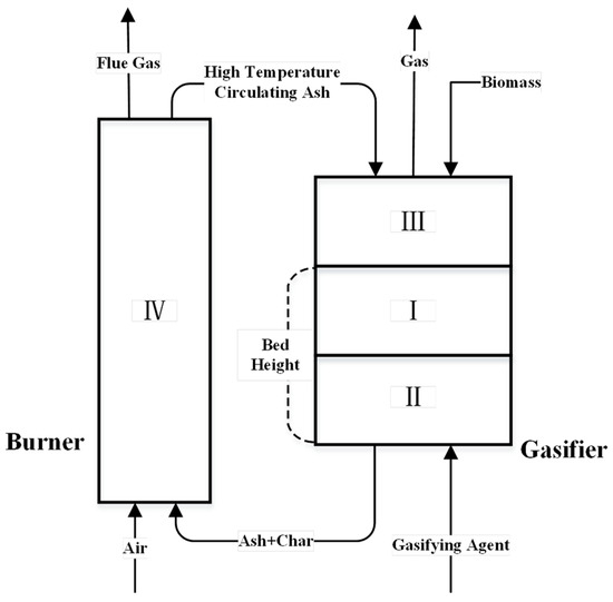 The DFB gasification process typically comprises three main processes: pyrolysis, gasification, and combustion. Based on the primary reactions involved, the entire DFB system can be divided into four distinct regions: I, II, III, and IV (refer to Figure 1) [21,22,23]. Ideally, each region is responsible for accomplishing the corresponding reactions described below [24,25,26].