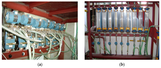 The temperature is measured using a K-type thermocouple with a tolerance/error tolerance of ±0.75; the differential pressure signals are measured and transmitted through pressure transmitters (Figure 3a). The frequency regulator controls the feeding motor’s frequency. All measurement results are converted into standard electrical signals and inputted into a computer for real-time data collection, display, and recording. The air volumes are measured using a rotameter (Figure 3b) and recorded manually.