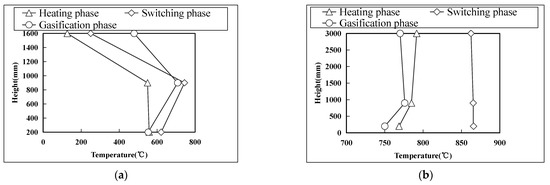 As depicted in Figure 4 and Figure 5a, the temperature distribution within the gasifier during gasification follows the pattern: T7 > T8 > T9. The maximum temperature difference observed during stable operation exceeds 200 °C, which can be attributed to the gasifier’s operational characteristics. The middle section of the gasifier serves as the high-temperature bed material mixing area, functioning as the primary gasification reaction zone. The bottom section, on the other hand, is another significant area for gasification reactions. Here, biomass particles absorb heat and undergo pyrolysis during the settling process, leading to a lower temperature at the bottom. The top section represents the gas phase zone, which exhibits a lower temperature due to heat dissipation and secondary cracking. In contrast, the combustion furnace demonstrates a uniform temperature distribution along its height direction. In the combustion state, the temperature difference between the bottom and top of the combustion furnace is 28 °C. During gasification, the temperature difference between the top and bottom of the combustion furnace reduces to 17 °C, as illustrated in Figure 5b. This uniform temperature distribution can be attributed to the utilization of a circulating fluidized bed combustion method in the combustion furnace, along with a high circulation rate (with a calculated circulation rate of over 40 under gasification conditions). Consequently, the concentration of circulating bed material within the furnace remains significantly high.