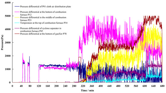 Figure 6 illustrates the variation curve of pressure difference at different positions during the heating, switching, and gasification processes in the DFB system. Pressure difference is a crucial parameter for assessing the operational status of a DFB system. It reflects important factors that influence gasification characteristics, such as the fluidized state of the combustion and gasification furnaces, bed material circulation, and material layer height. The DFB system exhibits distinct pressure distribution characteristics during different operational stages. During the heating stage, as the air volume increases, the bed material in the combustion furnace transitions from a critical fluidized state to a circulating fluidized state, resulting in a sudden increase in pressure difference (P12) in the dense phase zone of the combustion furnace. The gradual increase in pressure difference (P34) at the top of the combustion furnace indicates a corresponding increase in the amount of circulating bed material, which influences the temperature of the gasifier; in the subsequent stages, the pressure difference (P12) in the dense phase area of the combustion furnace abruptly decreases, while the pressure difference in the middle of the combustion furnace (P23), the pressure difference at the top of the combustion furnace (P34), and the pressure difference in the gasification furnace (P78) experience a sudden increase. This indicates that the combustion furnace enters a rapid fluidized transition state, and the material layer in the gasification furnace increases. By adjusting the wind speed, the height of the material layer inside the gasifier can be modified, which is reflected in the pressure difference (P78). The height of the gasification furnace material layer directly influences the residence time of biomass in the gasification furnace, which subsequently affects the characteristics of the gasification products. The height of the gasification furnace material layer can be adjusted by the air volume of the lower return feeder and is reflected by the pressure difference (P78). The distribution patterns of gas composition, cold gas efficiency (CGE) (Equation (7)), and carbon conversion rate (Equation (8)) were investigated in gasification furnaces with material layer heights of 100 mm, 200 mm, and 400 mm, operating at a temperature of 650 °C, Ca/C ratio of 0.4, and S/B ratio of 1. The findings are depicted in Figure 7 [27,28,29]. The experimental results demonstrate that the height of the gasification furnace material layer has a significant impact on the gas composition, CGE, and carbon conversion rate. Increasing the height of the material layer in the gasification furnace (thus extending the residence time) positively influences the volume content of H2 and the carbon conversion rate in the gas. This can be attributed to the longer residence time for raw material gasification and increased contact time between the gas and calcium absorbent, which enhances carbon capture.