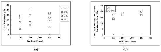 (a) Effect of bed material height on gas composition; (b) effect of bed material height on cold gas efficiency and carbon conversion rate.