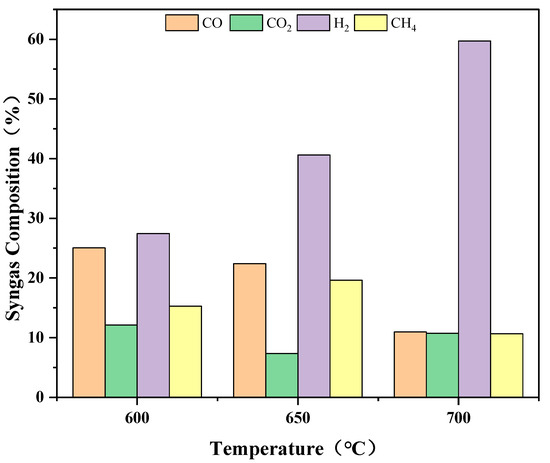 The impact of temperature on biomass gasification products is illustrated in Figure 8, where the gasifier’s middle temperature (T7) is set at 600 °C, 650 °C, or 700 °C. The results demonstrate significant variations in gas composition with temperature changes. Firstly, the volume fraction of H2 in the gas increases notably with temperature, rising from 27.45% at 600 °C to 59.7% at 700 °C. This increase can be attributed to the breaking of hydrocarbon bonds in organic macromolecules as the temperature rises, resulting in a higher concentration of volatile components. Secondly, the volume fraction of CO2 initially decreases and then increases with increasing temperature, ranging from 12.14% at 600 °C to 10.74% at 700 °C. The initial decrease may be attributed to the absorption of a considerable amount of CO2 by calcium oxide, which promotes the progress of the water–gas shift reaction and methane reforming reaction, leading to increased H2 production. As the temperature continues to rise, the reaction rate between calcium oxide and CO2 is impeded, resulting in a slower increase in the volume fraction of CO2. Thirdly, the volume fraction of CO gradually decreases with temperature, ranging from 25.03% at 600 °C to 10.95% at 700 °C. The presence of calcium oxide facilitates the significant reduction in CO’s volume fraction as it is consumed in the water–gas shift reaction. Lastly, the volume fraction of CH4 initially increases and then decreases with temperature, ranging from 15.27% at 600 °C to 10.65% at 700 °C. The increase in CH4 concentration is primarily attributed to the pyrolysis of biomass raw materials and tar cracking, as their generation rate in the reactor surpasses that of the methane reforming reaction. The reaction system inside the gasifier is the coupling and equilibrium of various reaction subsystems, such as tar cracking reaction, water gas shift reaction, and methane generation and reforming reaction, and is influenced by the chemical reaction rate. Thus, a perfect explanation for experimental phenomena is not easy. The increase in CO2 at 650 °C to 700 °C may be influenced by chemical reaction kinetics factors.