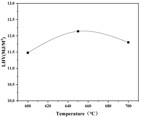 The calorific value of the gas exhibits a characteristic trend with temperature variations, as depicted in Figure 9. It follows an initial increase and then a decrease pattern as the temperature rises. The range of relatively high calorific values is observed between 640 °C and 660 °C. This behavior can be attributed to the changes in gas composition at different temperatures. Between 600 °C and 650 °C, the volume fraction of CO decreases while the fractions of H2 and CH4 continue to increase. This shift in gas composition leads to an overall increase in the total gas calorific value. In this temperature range, the increase in H2 content, combined with CH4, contributes significantly to the higher calorific value of the gas. However, as the temperature exceeds 650 °C, both the CH4 and CO fractions start to decrease while the H2 content continues to increase. It is important to note that CH4 is a gas with a high calorific value, and its presence significantly influences the overall calorific value of the gas. Consequently, after surpassing 660 °C, the total calorific value of the gas begins to decline due to the decrease in the CH4 fraction.