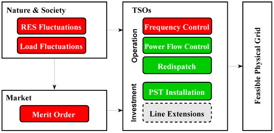 In this paper, we propose an algorithm to find the minimal number and location of PSTs that can guarantee system feasibility and limit redispatch costs for all scenarios in a continuous uncertainty set. Considered uncertainty factors are renewable, and load fluctuations as well as the corresponding dispatch decisions are determined by markets or load–frequency control, see Figure 1. During PST placement, we take into account the grid operators’ situation-dependent control options, such as specifying PST settings and redispatch orders to the attached power plants. Our algorithm thus produces, as a byproduct of the PST placement task, control policies to dynamically determine the PST settings and the redispatch orders. These policies are assumed to be affine linear in the uncertain factors in our work. They are chosen optimally in the sense that they minimize the worst-case redispatch cost in this class of controls. Since we consider the often strongly non-linear dispatch decisions by markets and frequency control as part of the uncertainty set, the linearity assumption for small to medium-sized redispatch corrections is plausible.
