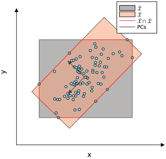 Figure 2. Uncertainty set defined as the intersection of the smallest non-rotated hyperrectangle X ˜ that encloses all scenarios, and a rotated hyperrectangle X ^ in the direction of the data’s principal components that also encloses all scenarios. (Plot inspired by [17]).