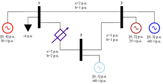 We first apply the proposed algorithm to the grid in Figure 3. The figure also contains the values of the loads, generator limits and unit costs, as well as line capacities and susceptances. The unit cost of wind production has a negative value, mirroring precedence for renewable power generation over conventional one, as well as standard subsidy policies.