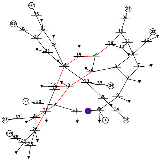 Figure 5. Topology of IEEE 39 bus test case. The lines marked in red have the largest capacity violations when solving the power flow without redispatch or PSTs. The shaded circle denotes the location proposed by our algorithm for installing a PST.