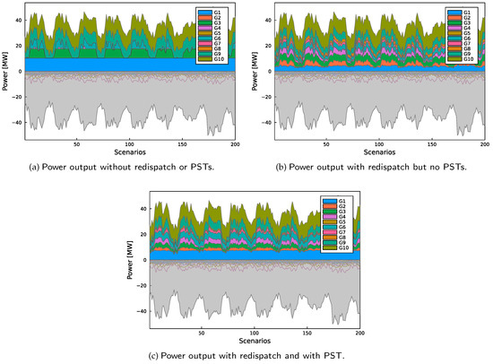 Figure 6. Power output of the 10 generators of the IEEE 39 system for 200 consecutive time steps. The gray area represents the total power demand. (a) The power output is defined by merit order, where the production cost is inversely proportional to the generator maximum active power output. (b) The power output is defined by the dispatch plus the redispatch generated by the optimal redispatch policy found using the proposed algorithm. (c) Same as (b) but with a PST installed between buses 1 and 39.