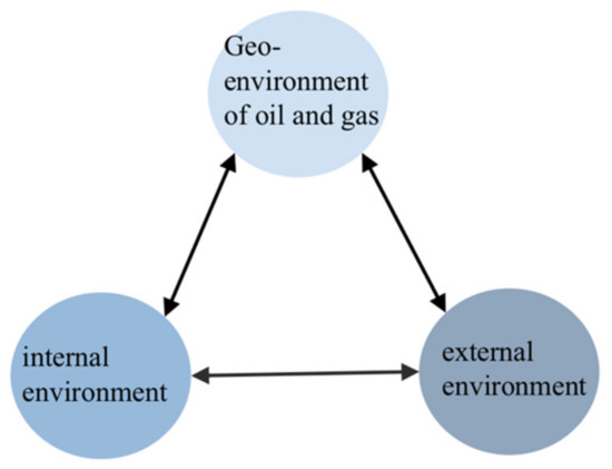 23]. The internal environment is the microenvironment of the industrialization of oil and gas science and technology achievements, the external environment is the macro environment of the industrialization of oil and gas science and technology achievements, and the geographical environment of oil and gas is the special environment of the industrialization of oil and gas science and technology achievements. The interaction among the three has a positive impact and reaches a harmonious degree, which makes the environment of the industrialization of oil and gas science and technology achievements sustainable development.