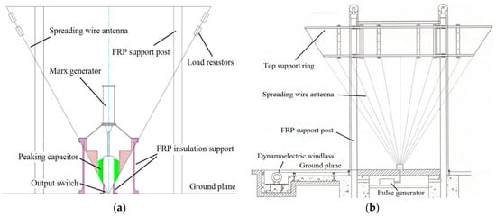 Electromagnetic energy can be coupled into the power and electronic systems through cables, antennas, and some holes or gaps, leading to damage or confusion in hardware or software, thus compromising the reliability and security of the system [1,2,3,4]. High-altitude nuclear explosion is an important way to generate strong electromagnetic pulses (EMP), which have the characteristics of a high peak field strength, wide coverage range, and multiple coupling targets. In these environments, modern information equipment must be protected [5,6]. Among them, the early (E1) environment of a high-altitude electromagnetic pulse (HEMP) is generated by the interaction of instantaneous gamma rays with the air medium, and the transient electromagnetic pulse waveform formed can be equivalent to an ideal double exponential waveform with a front edge of only a few ns, a pulse width of tens of ns, and a peak field strength of more than 50 kV/m, which can pose a threat to a lot of large- and medium-sized modern equipment [7]. Building an EMP simulator in the laboratory that can generate a strong electromagnetic environment with the above indicators is currently the most realistic, economic and efficient method to improve the anti-HEMP performance of modern equipment, carry out EMP effect and protection performance tests, and conduct threat level assessments [8,9].