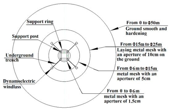 The radiation antenna of our simulator consists of an erection system and a conductive cone, as depicted in Figure 1. The erection system supports and suspends the inverted conical structure of the cone antenna. For this purpose, we use four FRP (Fiber-Reinforced Plastics) columns with a diameter of 200 mm, arranged in a square layout and standing vertically to the ground, as the main body of the erection system. The top crossbeam comprises four FRP pillars with a diameter of 150 mm, overlapped with the four columns perpendicular to the ground to form a stable rectangular doorframe structure. Four dynamoelectric windlasses, evenly distributed around the square support and located on the outer extension line at the diagonal of the ground projection of the four FRP columns, are used to operate the suspension system. Four high-strength insulated cables run along the ground grooves and the inside and outside surfaces of the four columns, connecting the windlasses to a frame cone at the top of the antenna. The conductive cone conducts the pulse current fed in from the driver and generates an electromagnetic field that radiates outward along the conical outer surface. To form the conductive cone of the antenna, we enclose 48 metal wires to create a conical shape instead of using a solid metal cone. The frame cone at the top of the antenna comprises two concentric metal rings and numerous evenly distributed FRP brackets, with a cone angle consistent with that of the antenna, to support the wire-mesh cone and maintain its conical structure. To enhance the electrical conductivity of the ground beneath the antenna and within the effective test area, we need to process the ground accordingly. The design layout of the conductive ground is depicted in Figure 3. Starting from the cone vertex of the inverted cone antenna as the center, we level the surface of the circular area with a diameter of 50 m, followed by a hardening of the cement within the area with a diameter of 25 m, in order to achieve the desired effect.