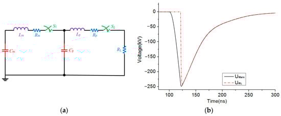 The equivalent circuit diagram of this mode is illustrated in Figure 4, where Cm denotes the Marx erection capacitance, Rm and Lm represent the discharging circuit’s equivalent resistance and inductance of the Marx generator, Cp is the peak capacitor, and Rp and Lp are the peak circuit’s resistance and inductance, respectively. RL stands for the load’s equivalent impedance, and S1 and S2 denote the Marx erection and pulse source output switches, respectively, assuming the values of Cm, Lm, Rm, Cp, Lp, Rp, and RL are as follows: Cm = 0.56 nF, Lm = 1.2 μH, Rm = 10 Ω, Cp = 160 pF, Lp = 150 nH, Rp = 10 Ω, and RL = 50 Ω. When S1 is turned on and, approximately 20 ns later, S2 experiences a breakdown, the output voltage waveform of the pulse source is depicted in Figure 4b, and the circuit successfully achieves an ideal double exponential waveform with a rise time of about 2.5 ns and a half-width of approximately 25 ns.
