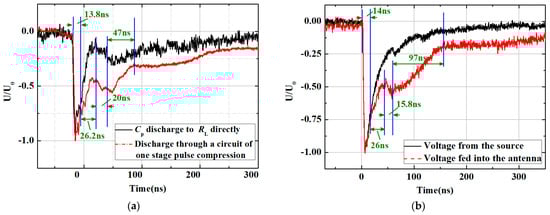 As depicted in Figure 6, the voltage waveforms of the pulse source fed into the antenna under different feed modes were obtained through practical measurements. The waveforms in Figure 6a and the red line in Figure 6b are derived from the measured waveform of the electric field near the antenna origin, while the black curve in Figure 6b represents the output voltage waveform of the bottom feed source when it is directly connected to the 50 Ω matched load. In Figure 6a, the black curve is the output voltage waveform of the peaking capacitor shown in Figure 1a, which is charged by the DC source and discharges directly into the antenna load. On the other hand, the red curve is the voltage pulse generated by a one-stage pulse compression circuit. In this circuit, a voltage pulse is initially formed by the discharge of a compact Marx generator, then compressed by a peaking capacitor, and finally, fed into the antenna load.