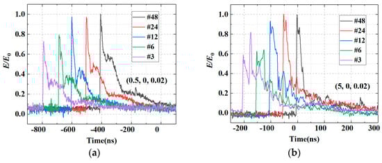 Figure 7 depicts the radiation field waveform variation at different points along the radius extension line in the positive north direction, as well as with different cable numbers of the wire-mesh antenna. It is observed that the amplitude of the radiation field at any given point decreases as the number of antenna cables reduces. Specifically, when the number of cables is less than 12, the decline in the peak value of the radiation field becomes significant. The convergence of wire-mesh antenna cables to the metal cone is shown in Figure 1, with the radiation field waveforms near the cone vertex remaining nearly constant when the number of antenna cables decreases, as illustrated in Figure 7a. However, at points away from the cone vertex, the radiation field waveforms are affected by the change in the number of wire-mesh antenna cables, as shown in Figure 7b. A distortion in the radiation field waveform is evident at the coordinates (5, 0, 0.2) when the number of antenna cables is less than 12. The severity of distortion increases as the number of cables decreases, indicating that the number of antenna lines should not be less than 12. In the subsequent research, the tests were conducted using either 24 or 48 antenna lines.