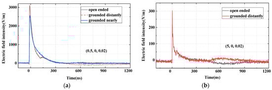 Influence of the antenna end conditions on the radiation field of the simulator. (a) Measuring point position: (0.5, 0, 0.02). (b) Measuring point position: (5, 0, 0.02).
