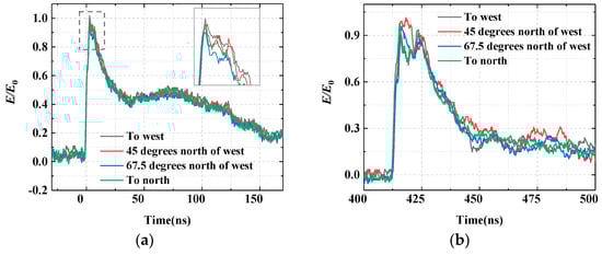 Figure 9 illustrates the radiation field waveforms measured at different angles around the normal of the cone antenna, with the distance between the monitoring point and the antenna cone point kept constant. The waveforms of the radiation field at different distances from the cone vertex are similar when the position of the monitoring point changes with the angle, except for some variations at the peak of the waveform. The connecting line between the cone point and the FRP supporting column of the antenna is oriented at a 45-degree angle north of west. The measuring point of 0.5 m from the antenna cone vertex is located between the connecting line of the cone vertex and the supporting column, whereas the measuring point of 6 m from the cone vertex is located on the extension line of the connecting line between the cone point and the column. As shown in Figure 9a, three distinct peaks appear at the top position of the radiation field waveform measured at the 0.5 m measuring point from the cone point and 45 degrees north of west. The three peaks become less obvious as the measuring point moves closer to the north or west, and the waveform becomes smoother. However, a clear double peak is observed on the waveform of the radiation field when the measuring point is at the position of 6 m from the cone point and the direction of west or north. The pulse width of the first peak of the waveform widens as the measuring point moves closer to the direction 45 degrees north of west, and the amplitude of the second peak decreases. The difference in the radiation field waveform is attributed to the reflection of the wave generated at the antenna’s FRP supporting column. The rise time of the radiation field waveform is only about 2.5 ns, and its shortest wavelength corresponding to the frequency domain is above 80 cm. However, the diameter of the supporting column is only 20 cm. If the FRP column were an ideal insulating medium, its bulk resistivity would be very large, and its dielectric constant would be about 4.5, resulting in a negligible reflection effect. The reason for the observed effect may be that the cement poured into the hollow FRP column to increase its strength also increases the dielectric constant and body conductivity of the supporting column, enhancing its reflection effect on the radiation field.