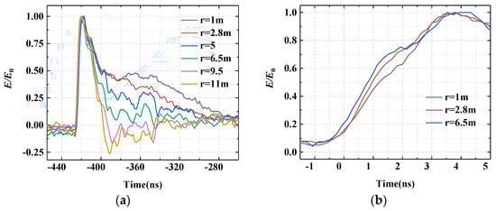 Figure 10 illustrates the radiation field waveforms measured at different distances from the monitoring point to the cone antenna vertex, with a fixed angle around the normal of the cone antenna perpendicular to the ground (at the direction of north). The amplitude of the radiation field measured at the monitoring point, which gradually moves away from the cone point, decreases with the law of 1/r when the distance r varies from 1 m to 11 m. However, the front edge of the radiation field remains basically unchanged, as depicted in Figure 10b. The rise times of the radiation field waveform measured at different positions are all between 2 and 3 ns by adjusting the working state of the internal switches of the pulse source. Specifically, the rise time of the radiation field measured at the position of 2.8 m from the cone antenna vertex is 2.8 ns, and the half-width of the waveform is 24.8 ns. At the 5 m position, the front edge of the measured radiation field is 2.4 ns, and the half-width is 22.8 ns. These measured waveform characteristics conform to the EMP experimental waveform specifications in the IEC61000-2-9 standard [7].