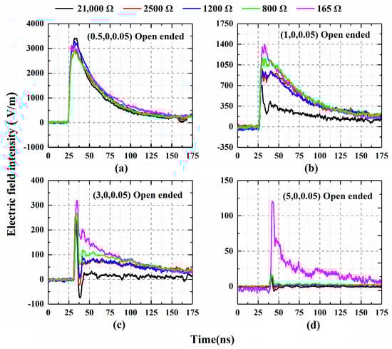 The radiation field waveform produced by small- or medium-sized EMP simulators is inevitably affected by reflection at the end of the antenna due to limitations in the antenna’s structure and size. One way to reduce this reflection effect is to load the resistance onto the antenna’s current-carrying wires [25,26]. To study the effect of resistance loading on the radiation characteristics of the antenna, 48 metal wires of the wire-mesh antenna were replaced with 24 tubular long water resistors with a 15 mm diameter. The resistance value of the water resistor can be adjusted by changing the conductivity of its internal electrolyte. Figure 11 shows the variations of the radiation field waveform measured at different measuring points in the north direction when the water resistance value is changed. The water resistance value indicated in Figure 11 is the total resistance of the 24 water resistors in parallel, which was measured by the bridge.