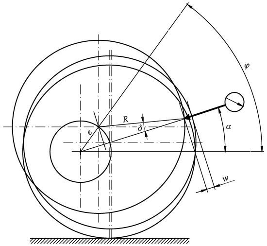 Based on the auxiliary diagrams shown successively in Figure 2 and Figure 3, mathematical relationships were then established linking the angular magnitude α, which is one of the parameters of the method, with the record of the measured profile of the eccentric displacement of the journal loaded with axial position deviation. These relationships can be expressed by the following equations: