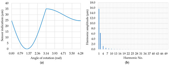 By knowing the amplitude values of the harmonics of the eccentricity profile, it is possible to select, from the amplitude spectrum of the total profile, the harmonics associated with the profile of the examined journal. The theoretical profile of the examined journal obtained using the proposed procedures is presented in Figure 14a, and its discrete amplitude spectrum is shown in Figure 14b. The separated harmonic values of the amplitude spectrum are listed in Table 4.