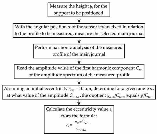 In order to determine the eccentricity e, in the case of a deviated journal profile measurement, with the sensor stylus angled at α to the profile to be measured and the supports positioned at an equal height, the algorithm presented in Figure 6 can be used.