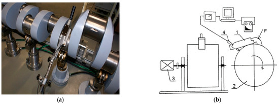 General view of the crankshaft measuring bench (a) and diagram of the measuring system (b) (designations: 1—MUK 25-600 measuring head, 2—crankshaft journal, 3—drive motor, 4—displacement sensor, F—measuring head processing force [28]).