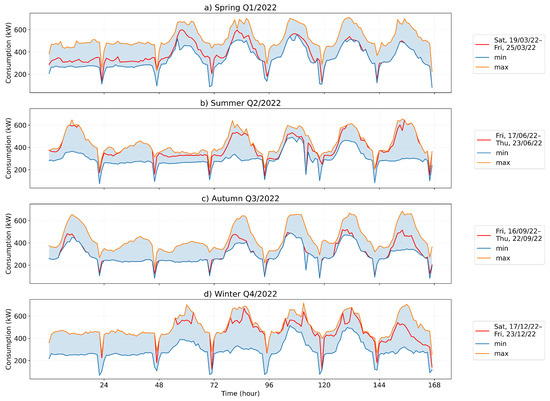 Figure 2 visualizes the aggregated consumption profiles of different entities at the RPZ of four weeks and the average consumption during the four quarters of 2022. The consumption is presented per quarter, and for the same resolution and time period, minimum and maximum hourly values are calculated. A visual validation check shows, on an hourly basis, how the selected week represents the other weeks of the year. The selected weeks are depicted in Figure 2 in red. During peak consumption, the consumption in the selected weeks is most of the days higher than the minimum week. In the second and fourth quarters of 2022, the consumption of the selected week approximates the maximum consumption, while in the third week, the consumption is close to the minimum consumption. Consequently, Figure 2 shows that the selected week presents both minimum and maximum consumption compared to other weeks of the season. Thus, the selected four weeks are assumed to be a valid representation of other weeks in the same year.