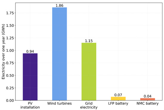 Equally important to the manufacturing impacts is the operational lifetime of the assets as they diverge (see Table A3). Thus, some assets might be required to be replaced earlier or later than others. However, for some assets, a replacement can be an essential driver for the environmental impacts and costs. As DOF simulates only one year, no asset degradation or replacement is included. The lifetime is a crucial parameter, as it is used to calculate the generated or stored electricity of each asset. Afterwards, the manufacturing impact of the dispatchable assets, such as PV and wind installations, can be divided over the generated electricity, representing an impact per kWh. In the case of stationary battery storage, only the discharged electricity is called from DOF, including the battery’s efficiency and potential resulting losses. Besides the electricity generation and storage, only lubrication for the rotor operation of the wind turbines is considered. Other maintenance impacts, such as water for cleaning the PV installations, which have a negligible impact on the total environmental impacts, are neglected [43,44].