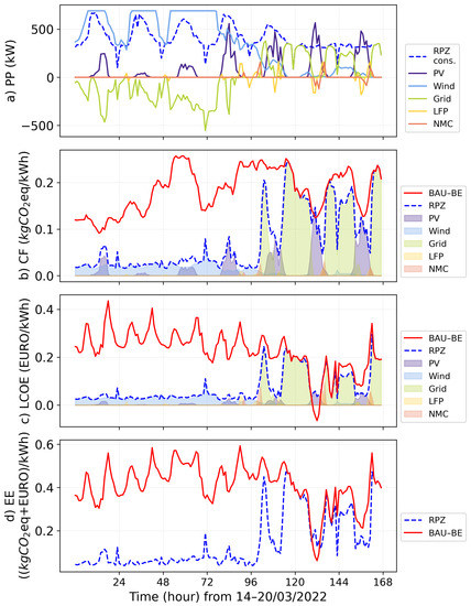 The selected week in spring is characterized by a weather change; from Monday to Wednesday, there is high wind production, almost enough to supply the RPZ demand and some PV electricity production during midday. During this time, no electricity is supplied by the Belgium electricity grid mix. Instead, the excess electricity from the wind turbine is fed back to the grid. From Thursday until the end of the week, wind electricity production declines, while PV electricity production grows during midday. However, PV-produced electricity is not sufficient to meet the RPZ demand every single hour. Thus, the remaining electricity is consumed from the Belgium electricity grid mix. At the same time, the batteries are charged and discharged to support the electricity supply. Following the weather conditions, at the beginning of the week, the wind turbines drive the CF of the RPZ energy system, supplemented by the CF of PV installations during midday. On a kWh basis, the wind turbines contribute the least to the CF. Consequently, the CF of the RPZ energy system outperforms the CF of the BAU. From Friday onwards, the CF of the RPZ approximates the BAU due to the higher CF of the Belgium electricity grid mix and in combination with the CF of the PV installations. Chart (b) in Figure 4 also shows that the renewable energy system at RPZ has, during most hours, a lower CF than the BAU. In terms of LCOE, similar observations compared to the CF can be made. In the absence of renewable energy source (RES) electricity production, the Belgium electricity grid mix accounts for the majority of the costs of the RPZ energy system. The LCOE of the RPZ remains in the spring week below the LCOE of the BAU, whereas the BAU performs worst in the selected week. These observations translate into the EE; at the beginning of the spring week, the EE of the RPZ energy system performs better than the EE of the BAU. Towards the end of the spring week, the EE of the RPZ approximates the EE of the RPZ (see Figure 4).