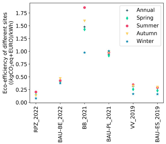 Eco-efficiency of three different energy systems and three different national electricity grid mixes (RPZ = Research Park Zellik; BE = Belgium; BB = Bèli Bartoka, the Polish residential site; PL = Poland; VV = Vega de Valcerce, the Spanish residential site; ES = Spain).
