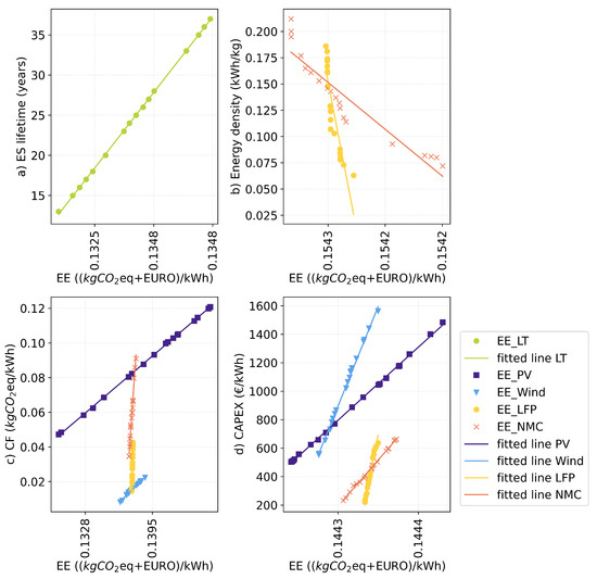 To understand the influence of particular modeling parameters on the EE, a sensitivity analysis is performed. Therefore, specific parameters are selected and modified to understand their impact on the EE. A total of 11 critical modeling parameters are investigated: (i) the ES lifetime, (ii–iii) the energy density of the two batteries and (iv–xi) both CF and CAPEX of PV installations, wind turbines and two lithium-ion batteries (LIB). In particular, one LIB has a cathode made of lithium iron phosphate (LFP) and another LIB with a cathode manufactured of lithium nickel manganese cobalt oxide (NMC). Out of a range from of the 11 selected parameters, 20 values are chosen randomly. Subsequently, their influence on the results is presented. In a final step, a linear regression analysis is conducted, which presents the correlation of a given modeling parameter with the EE.