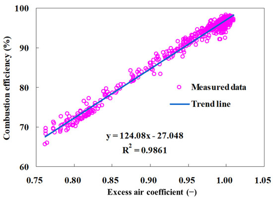 The relationship between combustion efficiency with excessive air/fuel ratio, from all the partial load data of Engines #1,2,3.