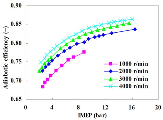High pressure cycle adiabatic efficiency vs. engine speed and load, from Engine #4 of Table 1.