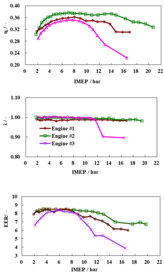 Variation of high-pressure cycle indicated thermal efficiency vs. excessive air/fuel ratio, EER and engine load, 2000 r/min, multiple engines.