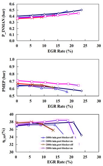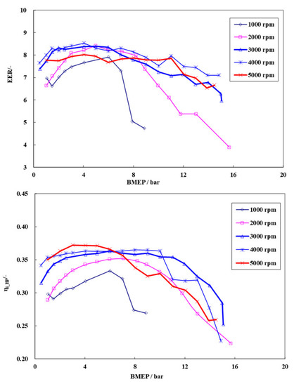 As shown in Figure 7, the introduction of externally cooled EGR indeed could increase the intake pressure and reduce pumping loss [18]. However, due to the fact that EGR retards the combustion process, the maximum amount of external EGR a gasoline engine could tolerate is around 20%. Hence, the pumping loss reduction potential through EGR is also very limited. It should be noted though, as shown in Figure 7, that although the introduction of EGR retarded the combustion process, which led to a reduction in EER, the indicated thermal efficiency had shown a tendency of increase rather than decrease. From Equation (2), one may conclude that it must be caused by an increased adiabatic efficiency due to a lower combustion temperature from the increased EGR.