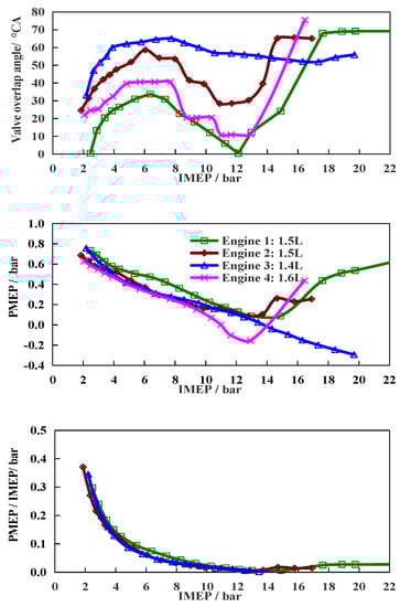 Variation of valve overlap, PMEP and PMEP/IMEPHP vs. IMEP for engine #1 to #4 at 2000 r/min.