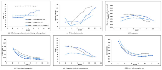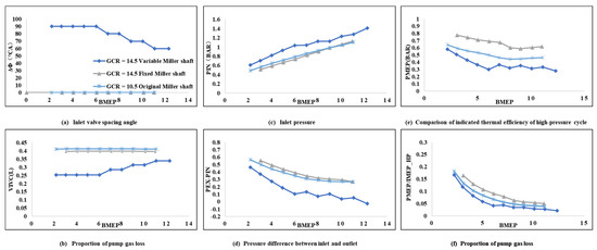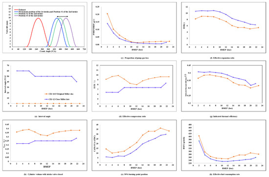 Therefore, in Figure 11, although the GCR = 14.5 fixed ECR case has a much higher ECR and the same level EER as the GCR = 14.5 variable ECR case, the former has higher in-cylinder thermal efficiency. On the other hand, its actual cylinder volume at IVC is much higher, with a much lower intake pressure and higher pumping losses, Figure 11b. The overall BSFC of the former is higher than the latter, as shown in Figure 11f. Obviously, at light load, the gain in efficiency from higher ECR could not compensate the pumping losses from the higher cylinder volume (and lower intake pressure). At a medium to higher load, the PMEP/IMEPHP term is already very low and therefore has very little influence on the BSFC. In those cases, the in-cylinder thermal efficiency takes the leading role on fuel economy; a higher ECR produces lower thermal efficiency and a higher BSFC because it causes lower EER.