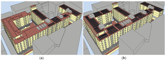 The maximum installed power for the photovoltaic system, in relation to the available coverage area, is equal to 193 kW. This system is characterized by an annual electricity production of 249,262 kWh, and it allows a coverage of the building’s energy demand by 22.1%. The IC is of EUR 328,100 and the SPB is approximately 3 years. Figure 3 shows the roof surface and its coverage by PV panels, in the two analyzed cases.