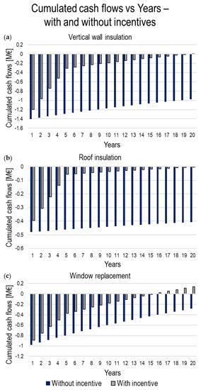 With reference to the solution that combines all the efficiency measures, which allows a very high-performance building (energy class A3) to be achieved, considering the lifetime of all involved interventions, a maximum payback time of 10 years is established, and an incentive rate of 40% would be necessary. Figure 5 shows a comparison of the cumulated cash flows in 20 years with and without incentives for the described solution. The calculation made provides that the forms of incentive evaluated are distributed over 5 years, as is the case for the most common and currently present incentives in Italy. Moreover, a discount rate of 3% is considered [37].