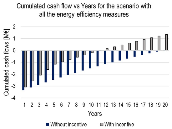 Cumulated cash flows vs. years for the scenario with all the energy efficiency measures: with and without incentives.