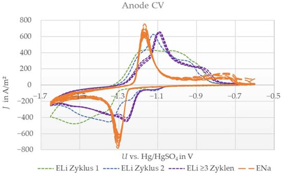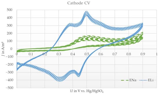 The CV measurements were performed with a potentiostat (VMP3, Biologic, Seyssinet-Pariset, France). Therefore, the above-described electrodes were inserted into a glass cell with a 1 × 1 cm² platinum counter electrode. As a reference, electrode mercury/mercury sulfate was used. Both the anode and cathode were measured with the prepared sodium electrolyte (ENa) and lithium electrolyte (ELi) separately. The scan rate was set to 0.1 mV/s. For cathodes, the voltage sweep was set between 0 V and 0.9 V against Hg/HgSO4. The anode voltage sweep was between −0.6 V and −1.65 V.