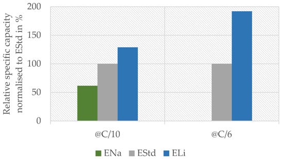 Capacity of the full cell measurement at C/10 (5th overall cycle, 3rd with C/10) and C/6 (23rd overall cycle, 1st with C/6) with solely lithium sulfate (ELi) with respect to sodium sulfate (ENa) electrolyte normalized to the capacity of standard full cell and electrolyte containing both ions (EStd).