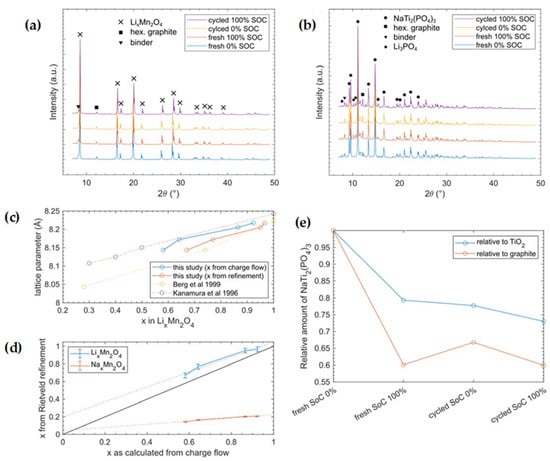 XRD patterns of cathode (a) as well as anode (b) samples for fresh cells directly after formation and cycled ones after 100 cycles. (c) shows the experimental lattice parameter as a function of x in LixMn2O4. Thereby, x can be extracted from the charge flow measured by the potentiostat, assuming the (de)intercalation of 1 Li+/e− or Rietveld refinement. Here, our data are compared with the literature [,] where only Li+ was intercalated. (d) Comparison of x in Lix(Nax)Mn2O4 with the charge flow extracted with a potentiostat and Rietveld refinement. The black line with a slope of 1 shows the idealized case in which 1 ion is (de)intercalated per measured e−, while in reality, additional electrons are needed to account for losses, cell resistance, side reactions, etc. The dotted lines are fitted to the data. Fit equations: (blue dotted line) LixMn2O4 -> f(x) = 0.8487x + 0.1999; (orange dotted line) NaxMn2O4 -> f(x) = 0.1815x + 0.0429). (e) Evolution of the NaTi2(PO4)3 amount in the measured anode samples. Here, the weight fraction of NaTi2(PO4)3 is divided by the weight fractions of TiO2 and graphite, respectively. The result is then plotted relative to the “fresh Soc 0%” sample.