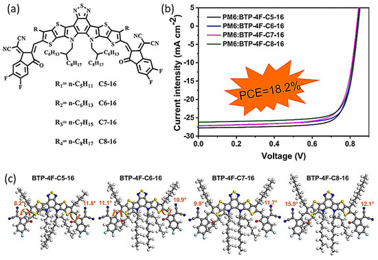 The length of the side chain is also a research hotspot except for the position of the side chain. In 2020, Hou et al. synthesized BTP-eC7 and BTP-eC9 by shortening the n-undecyl (C11) from n-heptyl (C7) to n-nonyl (C9) on the brink of BTP-4Cl-BO [46]. BTP-eC9, with relatively short alkyl chains, exhibits enhanced electron mobility, decreased Urbach energy, and suitable solubility in comparison to BTP-eC11. A maximum PCE of 17.8% for BTP-eC9-based OPVs can be achieved, along with JSC = 26.2 mA cm−2, FF = 81.1%, and VOC = 0.839 V. Wang et al. synthesized four acceptors, named BTP-4F-C5-16, BTP-4F-C6-16, BTP-4F-C7-16, and BTP-4F-C8-16, by extending the chain length from n-pentyl to n-octyl on the bithiophene units in 2021, as shown in Figure 5a [47]. The molecular dihedral angles between the terminal units and central core can be varied from 7.9 to 16° with the change of alkyl chain length. BTP-4F-C5-16 has a relatively small dihedral angle, achieving relatively good molecular planarity for forming compact π-π stacking. OPVs based on PM6:BTP-4F-C5-16 achieved a PCE of 18.20% with a FF of 77.68%, JSC of 27.78 mA cm−2, and VOC of 0.844 V, as shown in the Figure 5b. BTP-4F-C5-16 possessed the shortest alkyl chain, exhibiting good structural order, appropriate phase separation, and high electron mobility in its blend with PM6. BTP-4F-C5-16 has good planarity according to MDS measurement and DFT calculations, as exhibited in Figure 5c.
