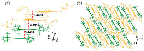 (a) The crystal π-stacking view of t-PyDIN (conformations A and B are marked as yellow and green, respectively) and molecular packing between the t-PyDIN molecules (b) along the π-plane. Reproduced from [59]. Reprinted with permission from ref. [59]. Copyright, 2022, Wiley.