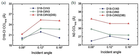 - Charge carrier transport. After the exciton dissociation, the free charge carriers will move toward their respective electrodes. The efficiency of free charge movement depends on the morphology of the film and the charge mobility characteristics of the semiconductor materials. The introduction of the D-A structure can realize intermolecular charge transfer and increase the electron mobility of the acceptor material. JSC and the fill factor (FF) were improved. The appropriate levels of distortion and alkyl chains can effectively influence morphology to enhance the JSC and FF [20,21].