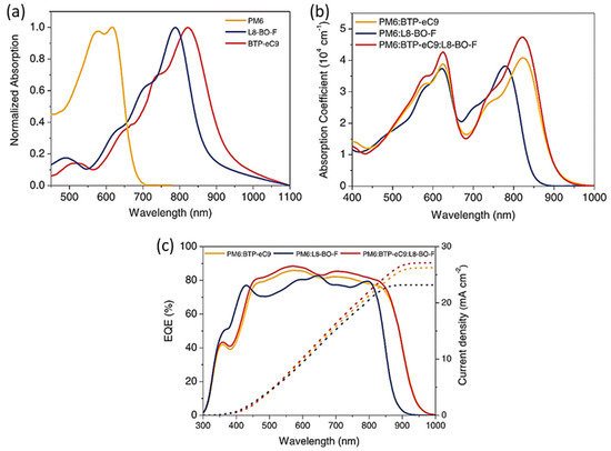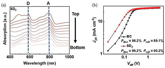 - Photon absorption and exciton generation. In order to improve the light capture efficiency of OPVs, the BHJ active layer should have a wide absorption spectrum and a high molar extinction coefficient. The introduction of electron-absorbing groups or the addition of conjugated acceptor materials can effectively reduce the lowest unoccupied molecular orbital (LUMO) level and band gap and broaden the absorption spectrum, increasing the short circuit current (JSC) in total [20].